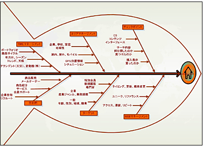 たとえば会社の上司から「売れる自社ホームページを企画せよ!」と命令が下ったとする。この場合、マイクロソフトの発想支援ソフト「Visio」の「フィッシュボーン」と呼ばれる発想ツールが役立つ。このツール、Visioでは「原因と結果」というダサい名前が付いているが、「フィッシュボーン」の名の通り、魚の骨みたいな図が作れるのが特徴だ(図)。