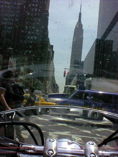 | 午後12時30分ごろ、走っている95号線からマンハッタンのワールドトレードセンターが見えた。 リンカーントンネルを越える手前の表示板にNEW YORKへようこそとあった。 走ってるからヘルメットの中の涙をふけないので困ったよ。 トンネルを越えるとエンパイアーステートビルが目の前に現れ、DS11に『これがエンターステートビルディングだよ』と教えた。 いま俺はソーホー地区の定宿にさしてもらっている小林さんのアトリエに落ち着いている。 だれにも会いたくなくて、一人でよく行くジャズバーで飲んでから深夜に帰りました。 思うことはたくさんあるけれど明日にします。 みなさん、今日まで応援ありがとう。 |