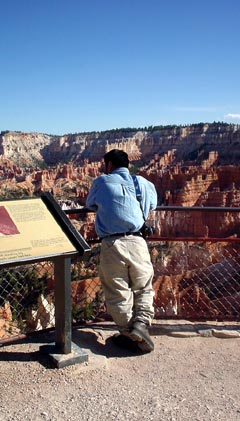| グランドキャニオンを選ばず、ここブライスキャニオンにやって来た。ここのほうがエキサイティングだから、というのがその理由なのだ。午後から繰り出し、サンセットを撮ろうと訪れたのだ。 | ここでもトレッキングができるというんで、早速コースを決め出発。自然が創造した芸術を撮影せんとくぼたつは愛用のカメラを取り出した。 | |